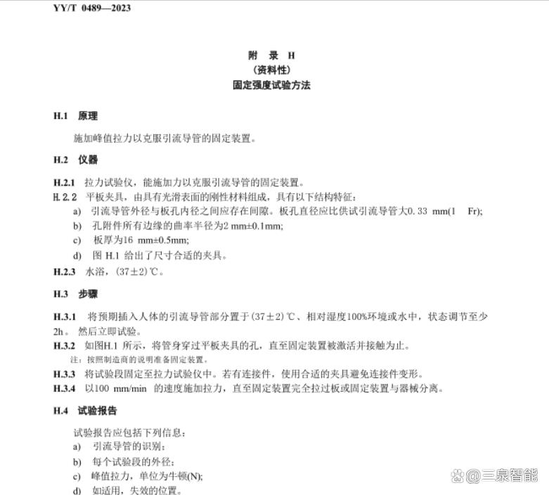 所以,不管是产品研发阶段,还是批量生产的质量检查,测一测引流管能承受的峰值拉力、固定装置装得牢不牢、哪里容易出现失效,都至关重要。好在YY/T 0489-2023附录H里,已经把固定强度试验的操作规范写得明明白白,从试验原理、夹具尺寸,到水浴条件、步骤流程,都有明确要求,既能保证测试结果准确,也能让不同机构的测试数据有可比性。